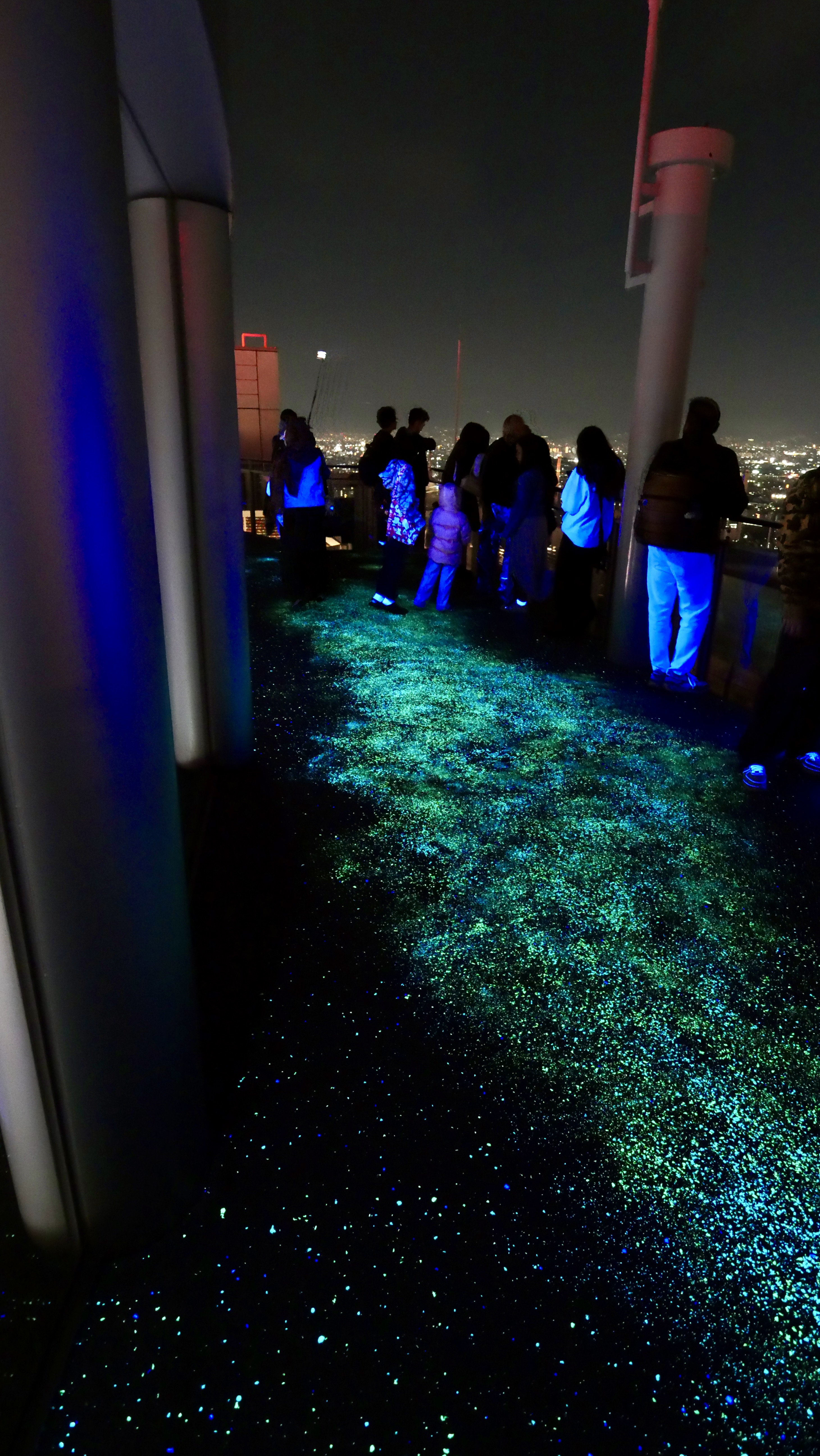 エスカレーターを登ると、ブラックライトで光る床材を使用した広い屋上庭園が。