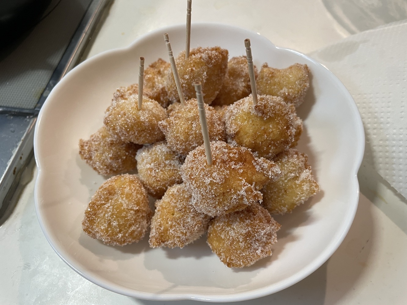 豆腐とホットケーキミックスだけを使ったドーナツで、材料もあれこれ入れなくていいから簡単だしおいしいしで家でもやってみました。