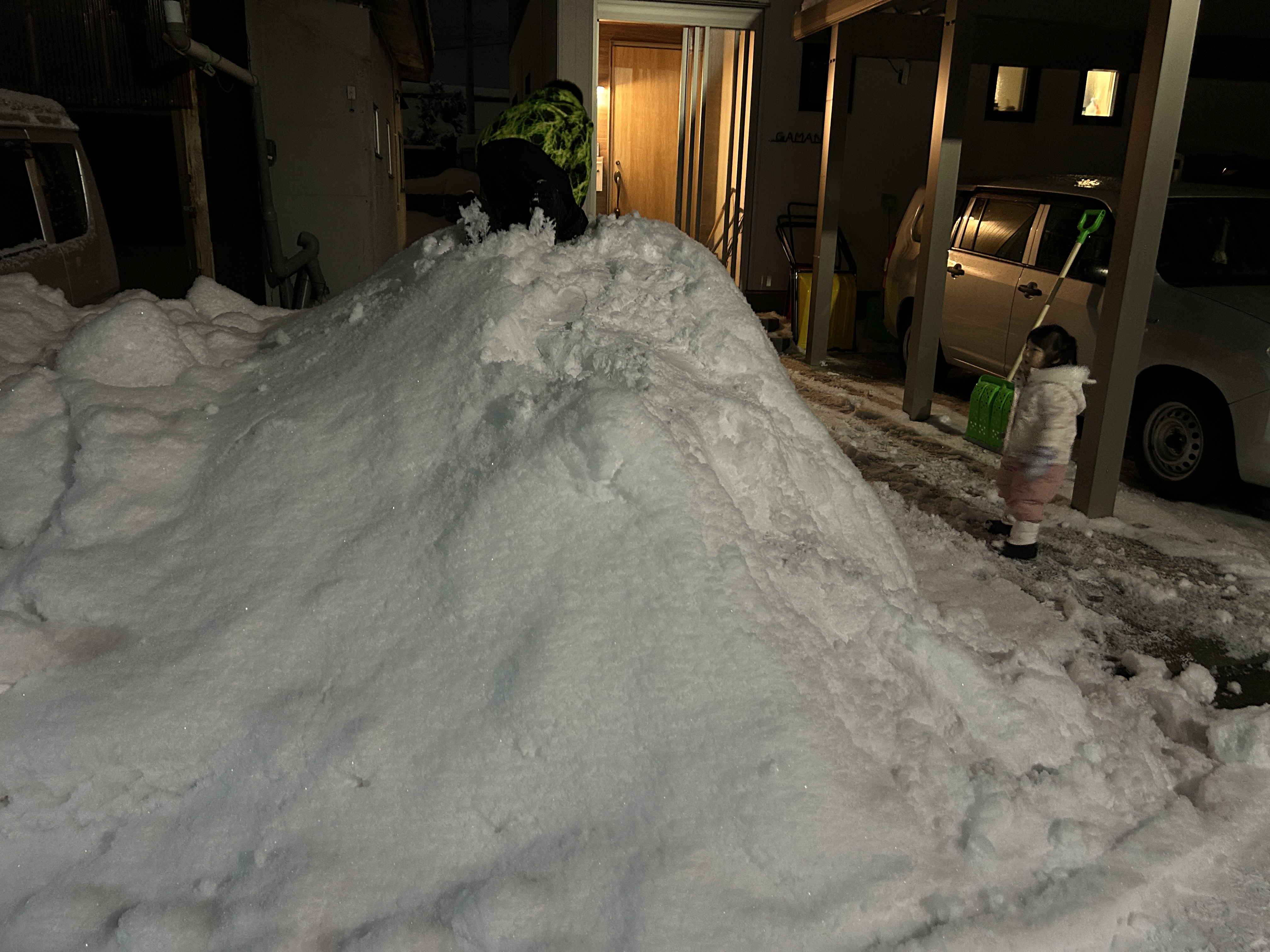 家の前に立派な雪山が上棟され
