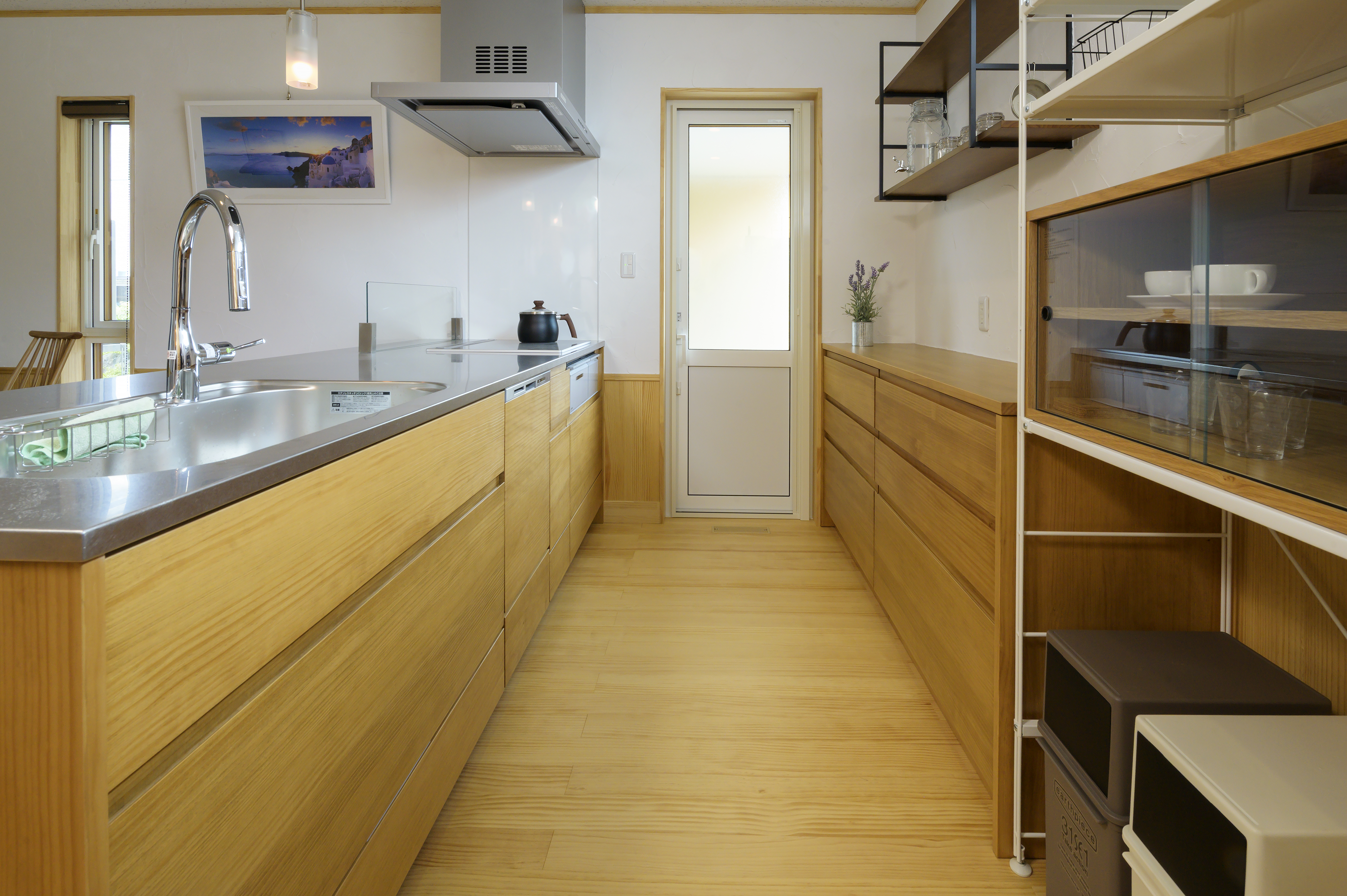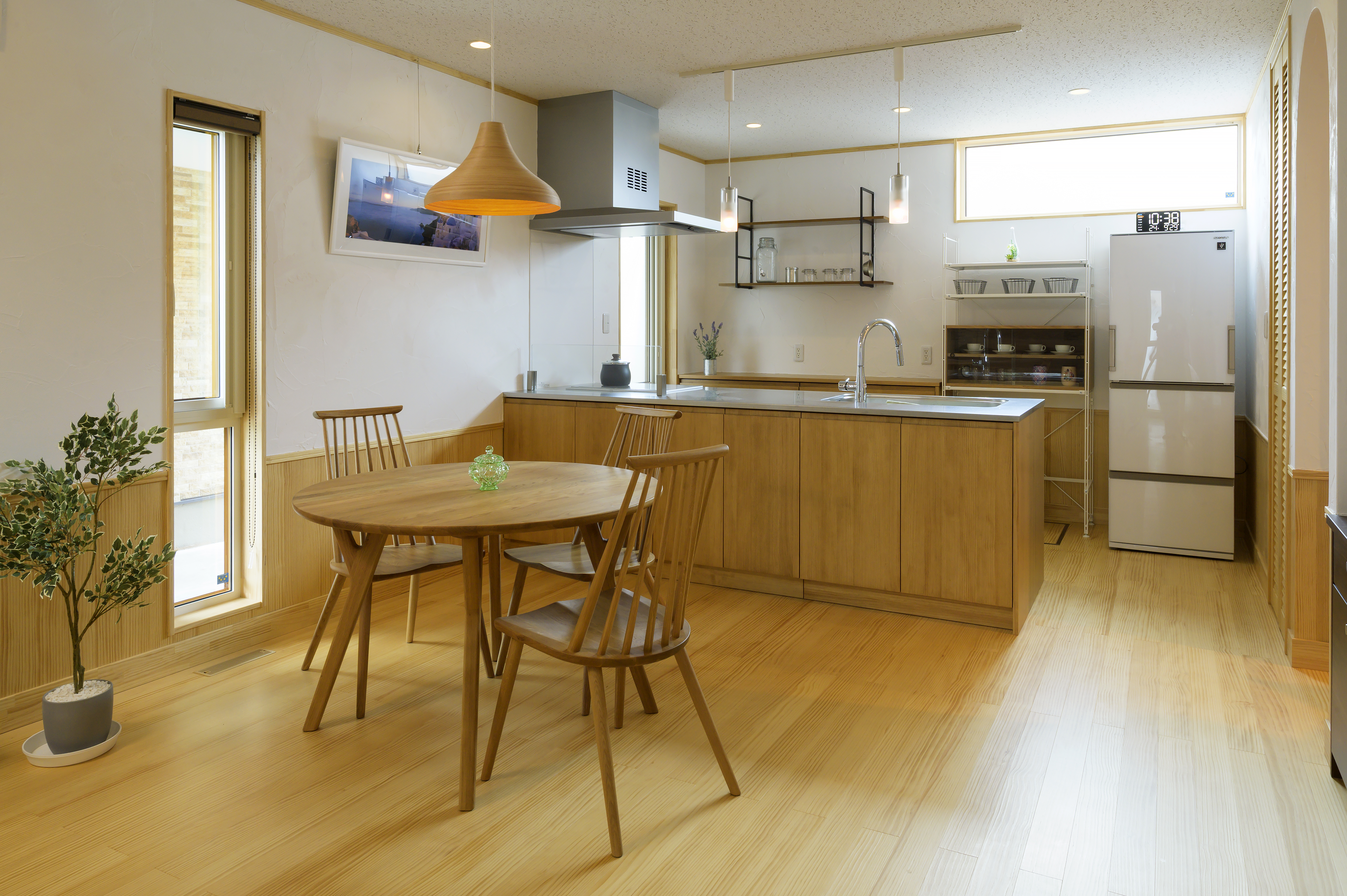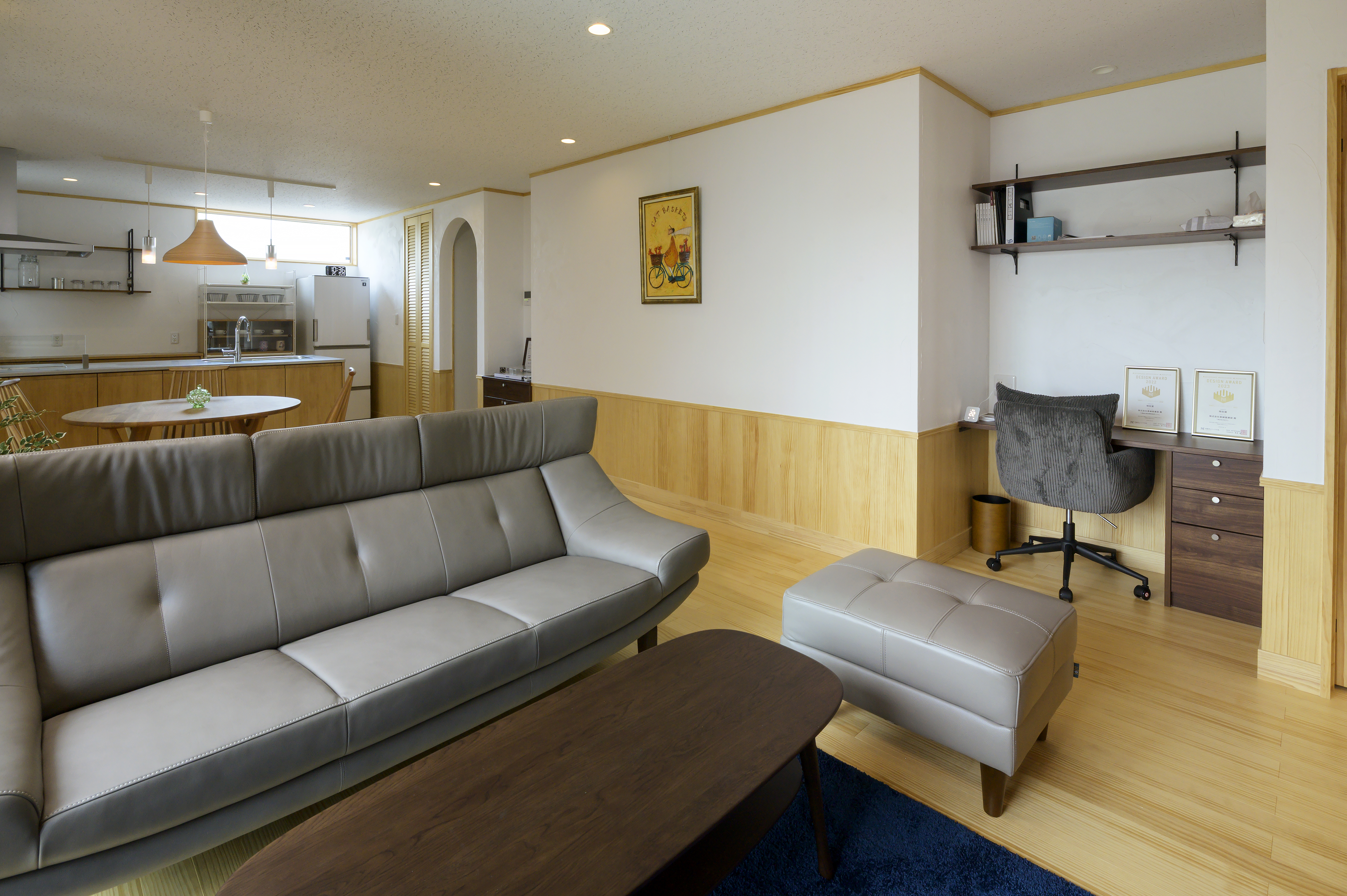 フローリング・腰壁・キッチン・収納扉は無垢材を使用。素足で歩くと木の温かみが感じられ、暮らしていくうちにまた違った雰囲気になっていきます。