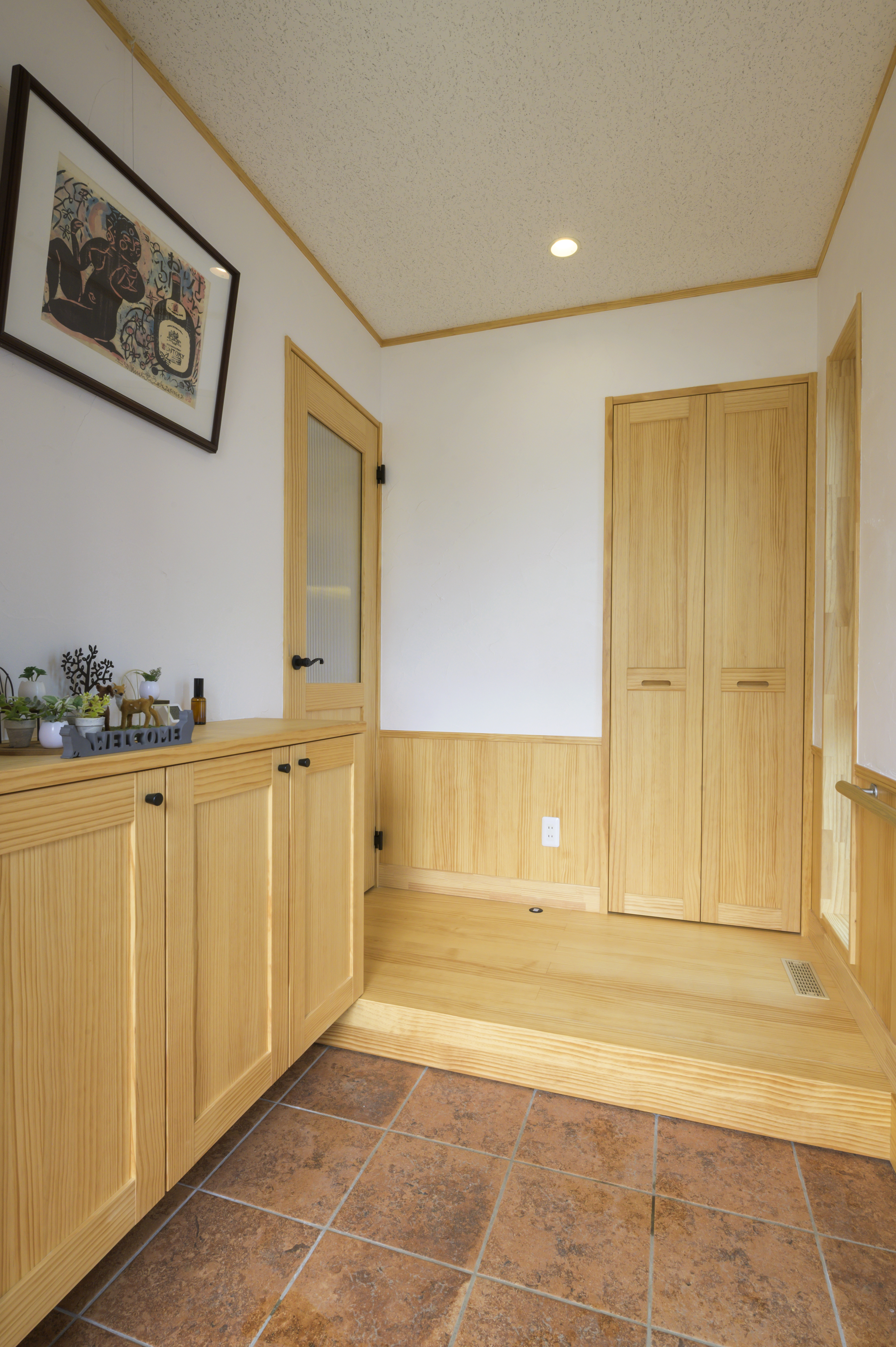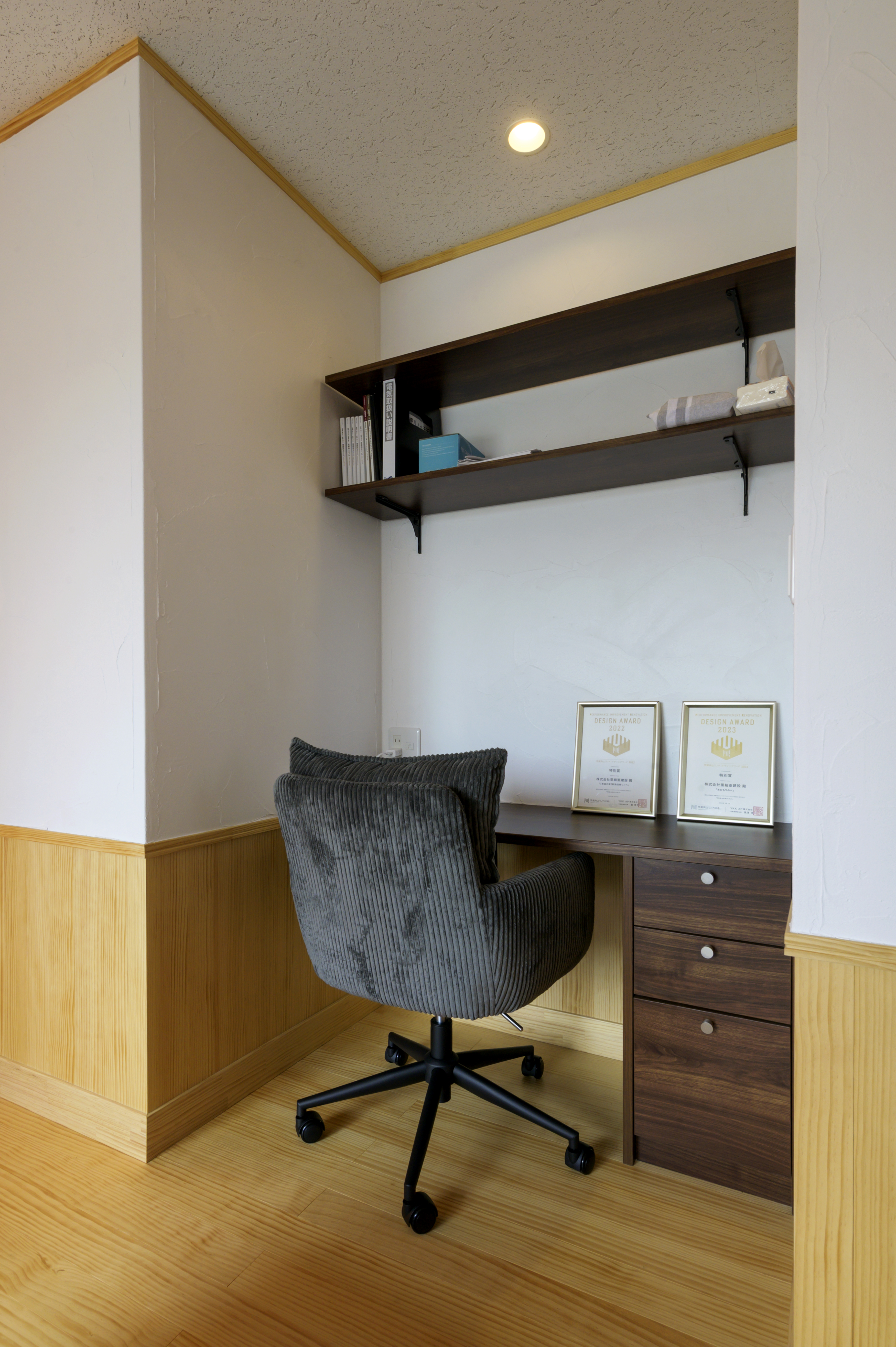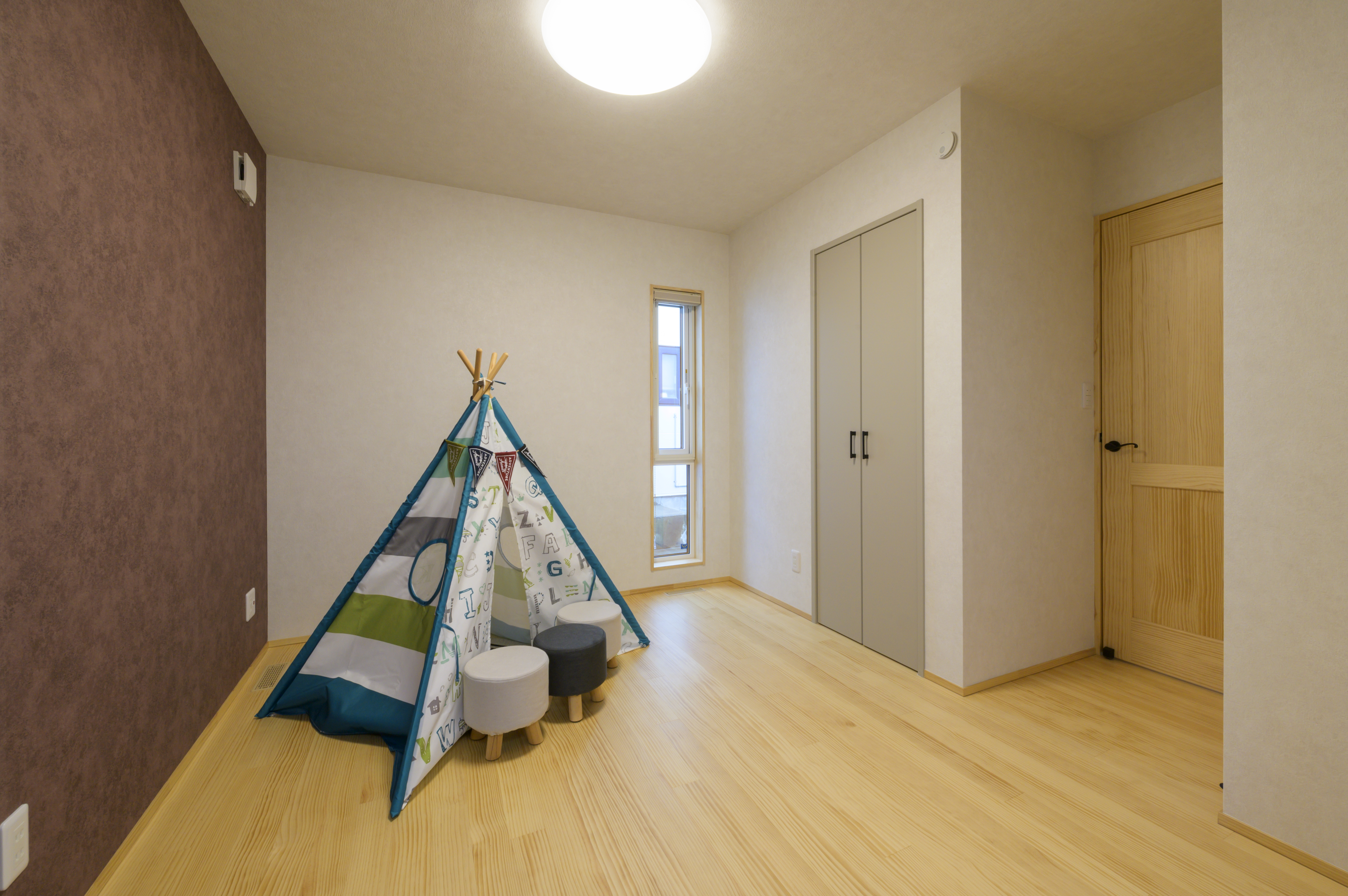 フローリング・腰壁・キッチン・収納扉は無垢材を使用。素足で歩くと木の温かみが感じられ、暮らしていくうちにまた違った雰囲気になっていきます。