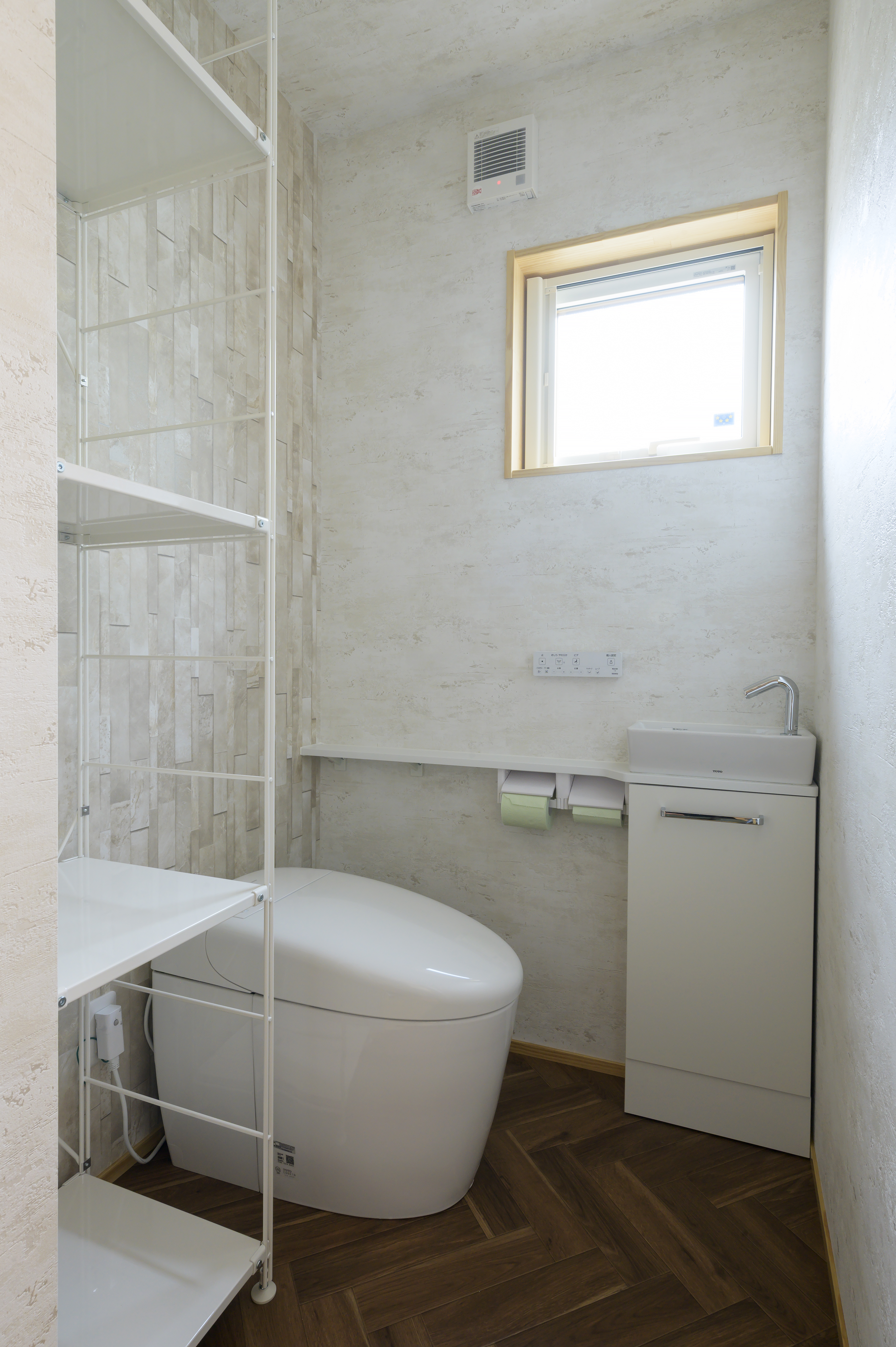 テレビ裏の壁は消臭・調湿効果のあるホタテの漆喰で仕上げました。